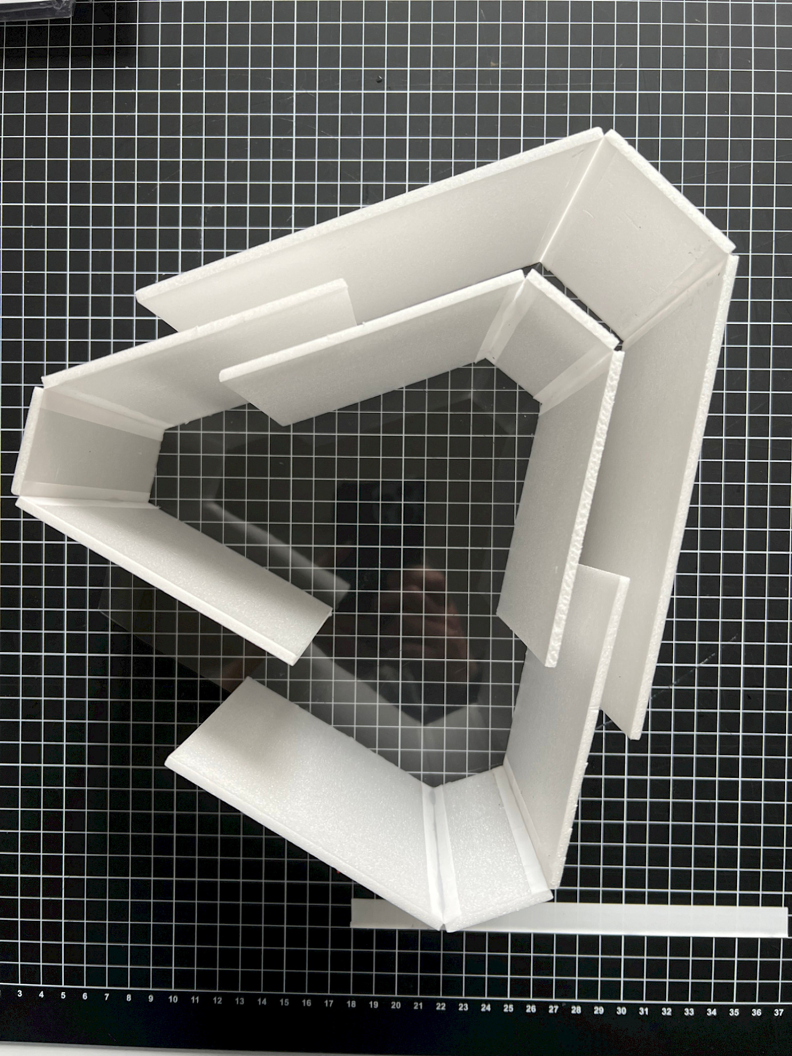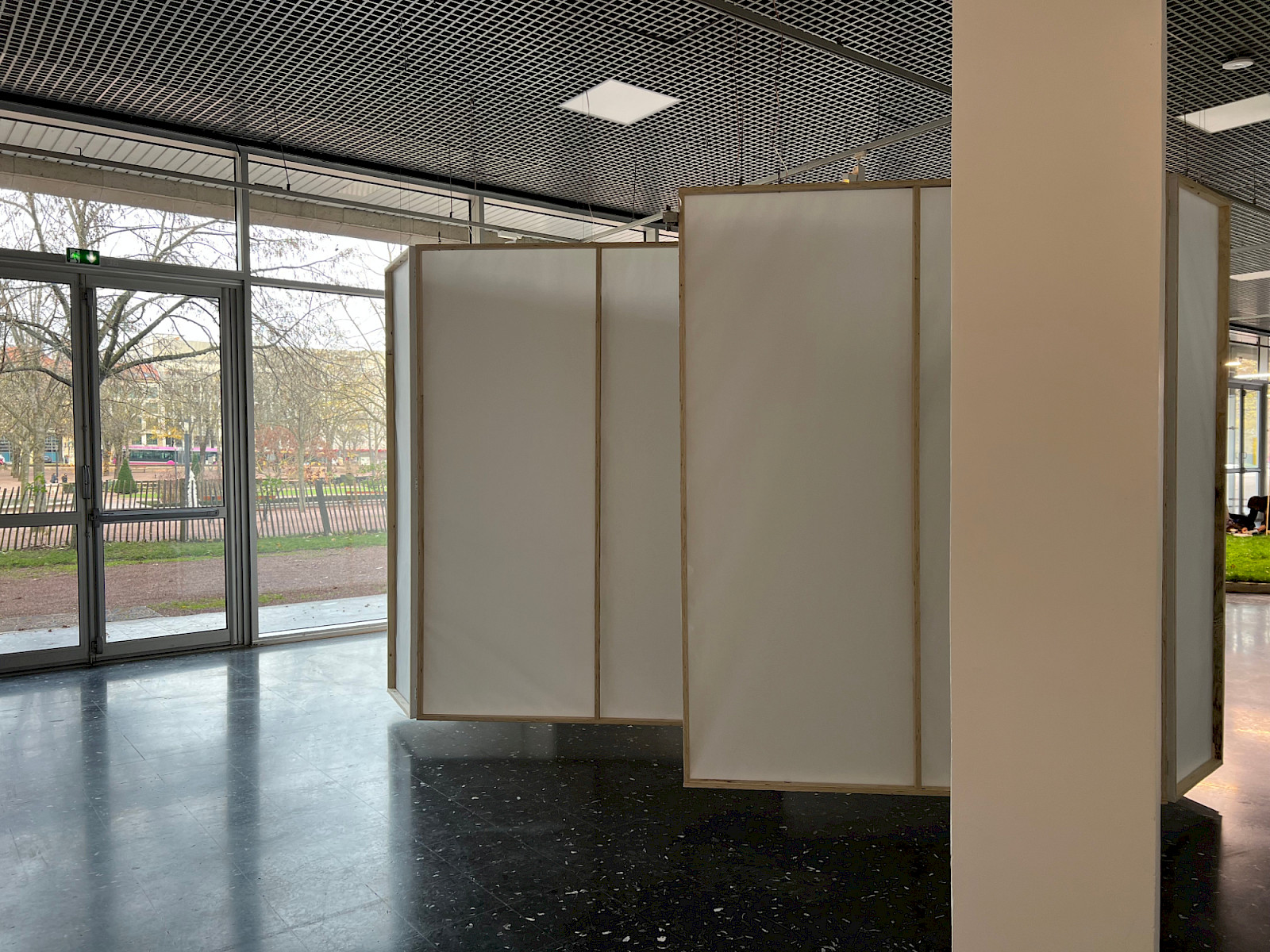 Für die Ausstellung zum Kunstpreis Robert Schuman 2025 entschied ich mich, mit meiner Recherche als Basis, aus der Formensprache der historischen Festungsanlagen von Metz sowie im Umfeld der ESAL-Galerie immer wieder auftauchenden Formen einen einfachen, begehbaren Raum in der Galerie zu entwickeln und dabei mit den mir vertrauten Materialien Holz, Papier und Motoren zu arbeiten. Weiterer Bestandteil meiner Arbeit sind Zeichnungen, in denen ich die Befestigungsanlagen aus den historischen Stadtplänen der Stadt Metz „entnommen“ habe.