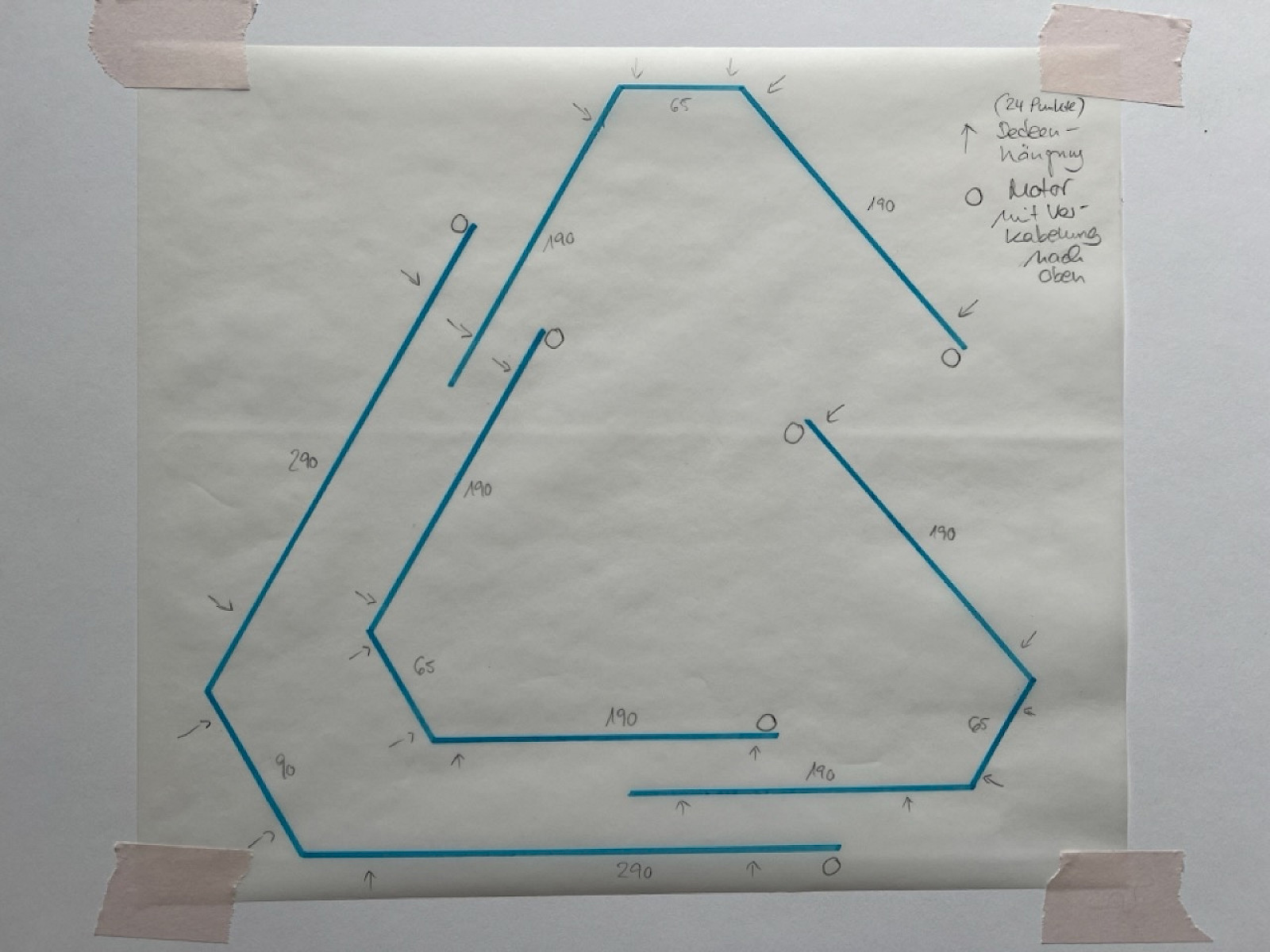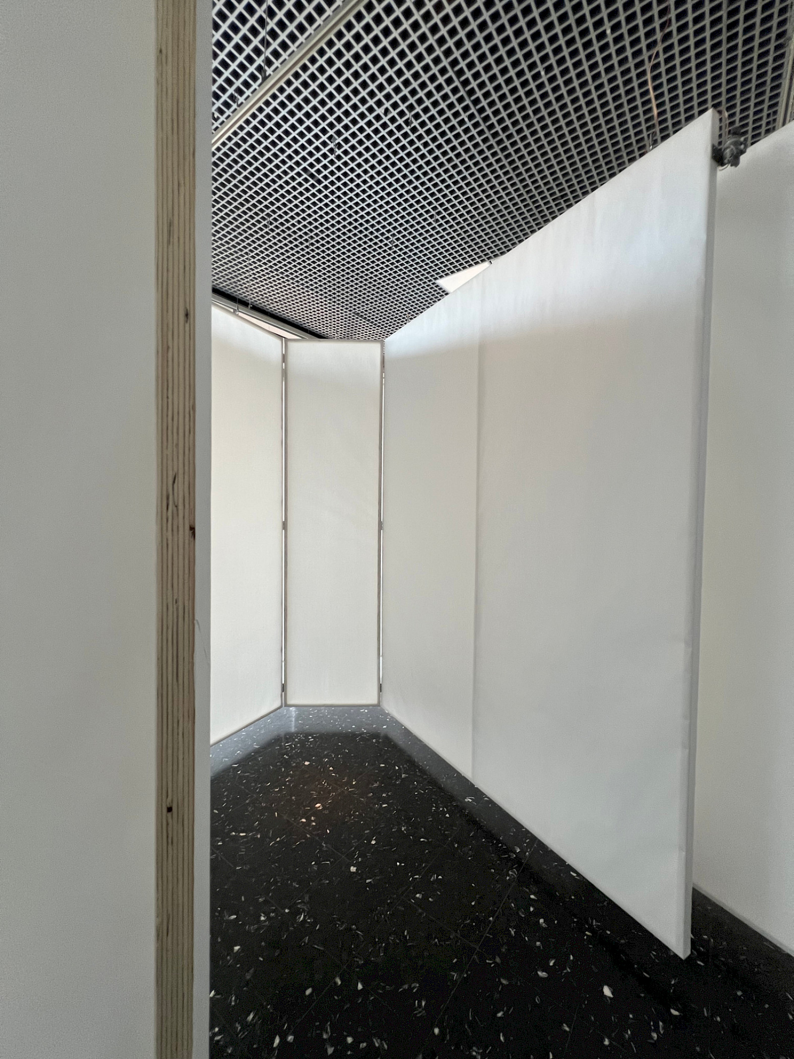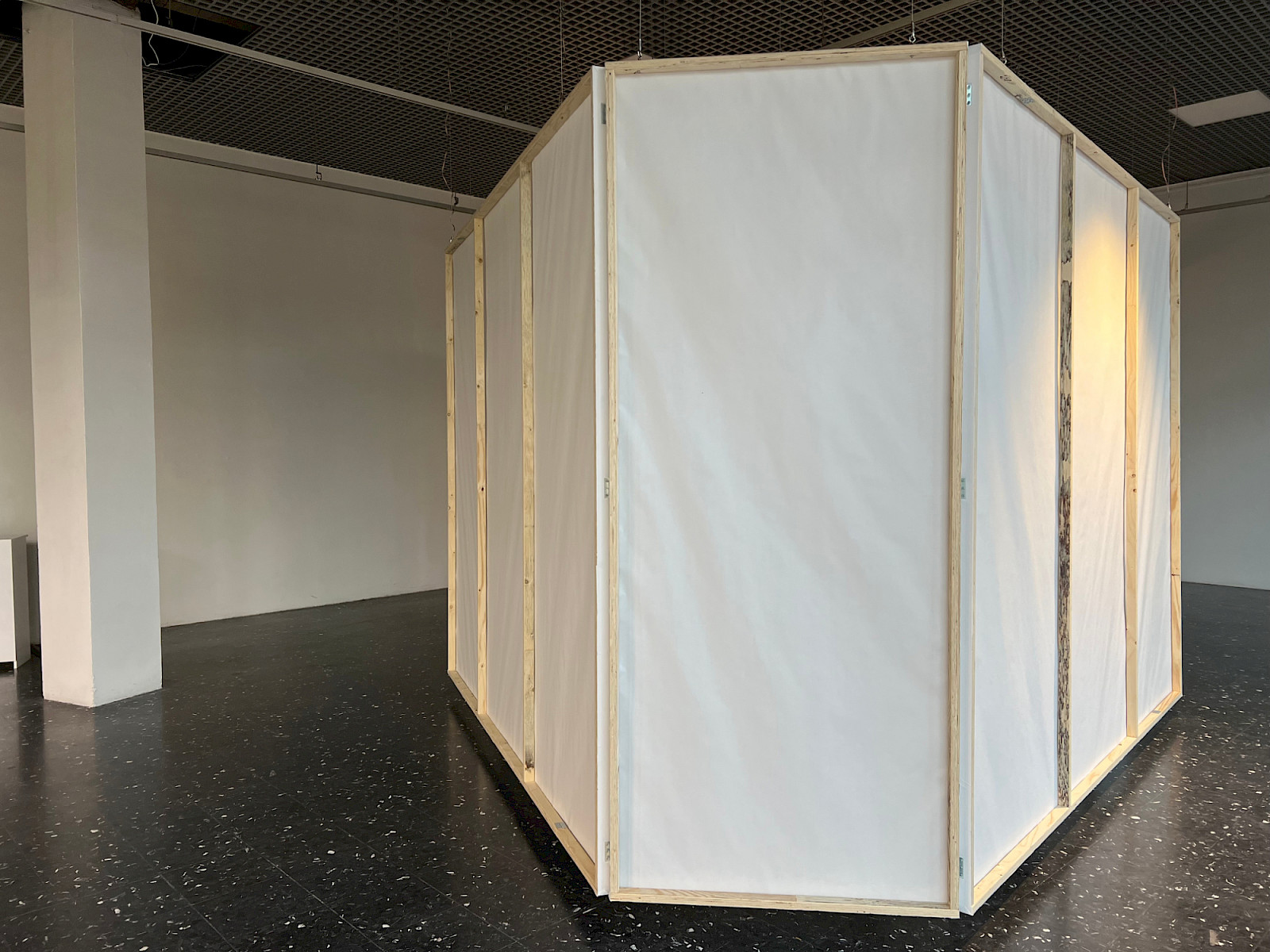 Meine Arbeit versteht sich als fragile Struktur: Von außen ist ihre Konstruktion offen sichtbar, innen bildet Papier eine dünne, geschlossene Haut. Der Raum umschließt den Körper, bleibt aber durch Ritzen, die labyrinthisch ineinander geschobenen Elemente, die den Raum bilden, und die schwebende Aufhängung offen und instabil. Motoren versetzen die „Wände“ in Bewegung, erzeugen Geräusche, die durch das bewegte Papier entstehen und die zwischen beruhigend und irritierend, spielerisch und bedrohlich wahrgenommen werden können.