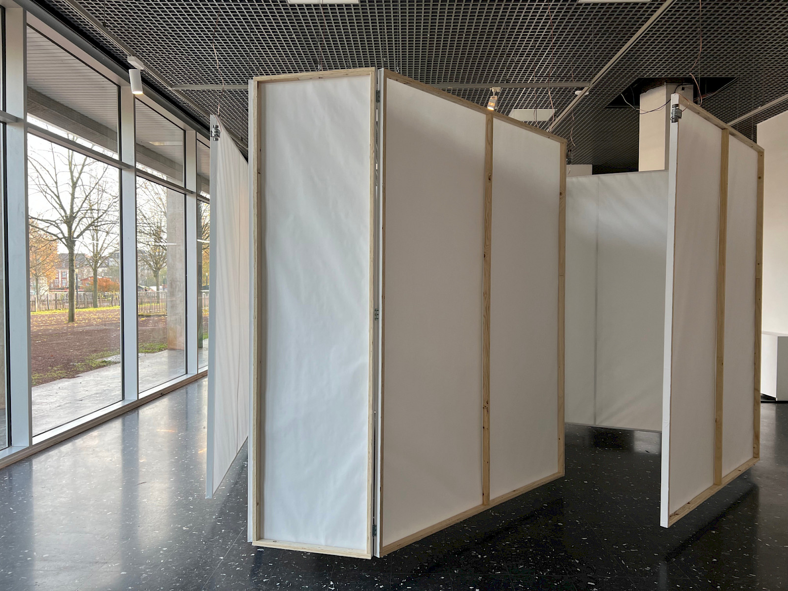 Raumangepasste Neu-Formation von sechs Papierobjekten im "Schwarzen Raum", einem Durchgangsraum im Saarbrücker Garelly-Haus, den man durchquert, um vom Eingang in den weiteren Ausstellungsbereich zu kommen. Die Papierobjekte beeinflussen den Weg durch den Raum.