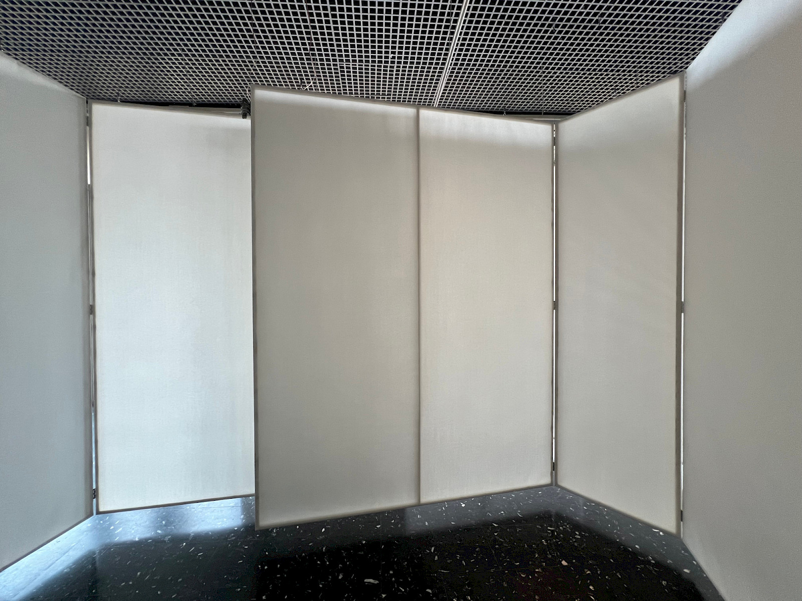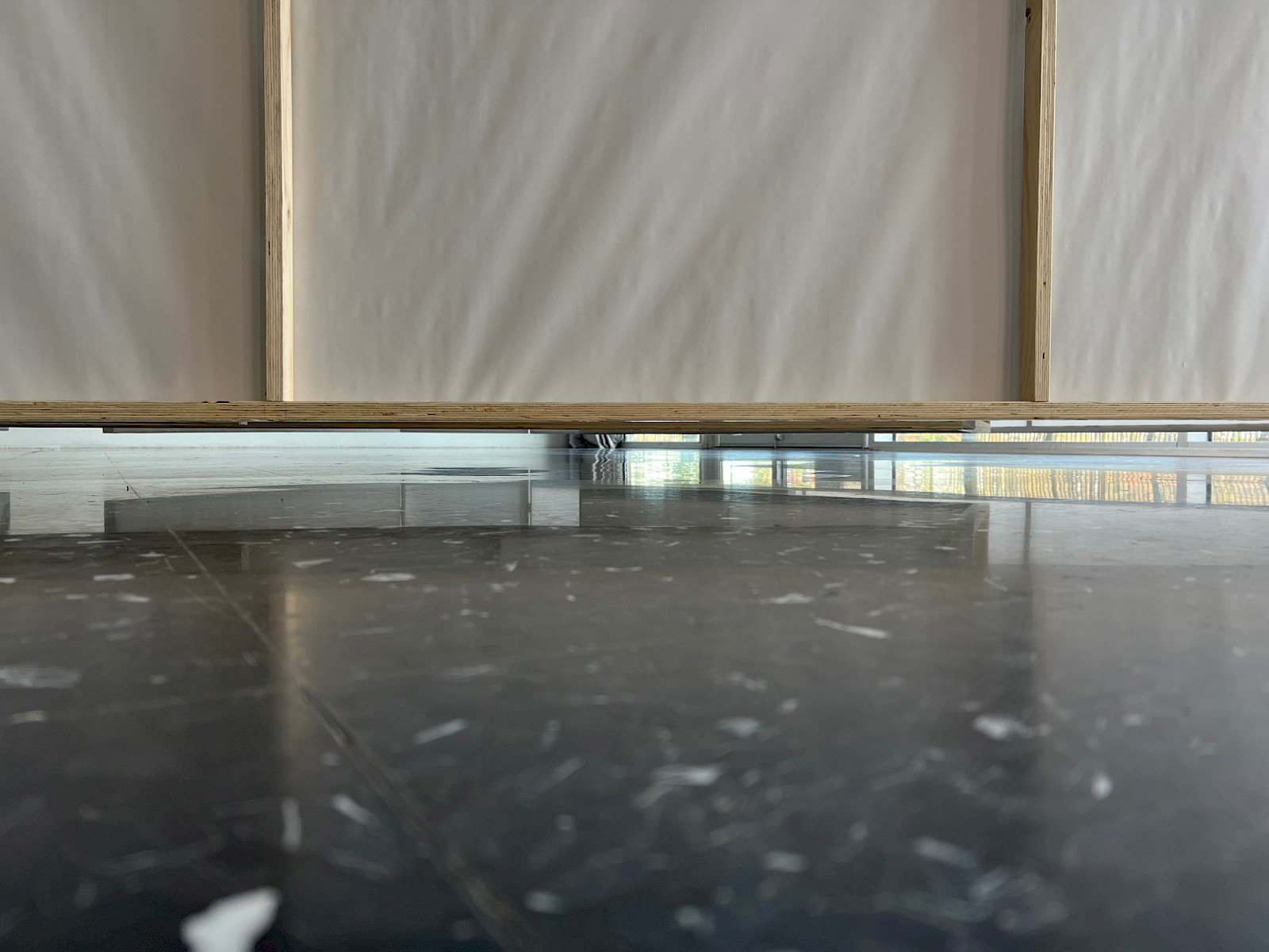 Die der Eingangstür gegenüber platzierten Betonplatten sind in ihrer fächerförmigen Hängung einer Besucherin oder einem Besucher zugewandt, sobald er oder sie den Raum betritt. Die Platten hängen still, reagieren mit einem ganz leisen, niederfrequenten Ton, der im Raum bereits vorhanden war, ohne auf eine Klangquelle zurückzuführen zu sein.