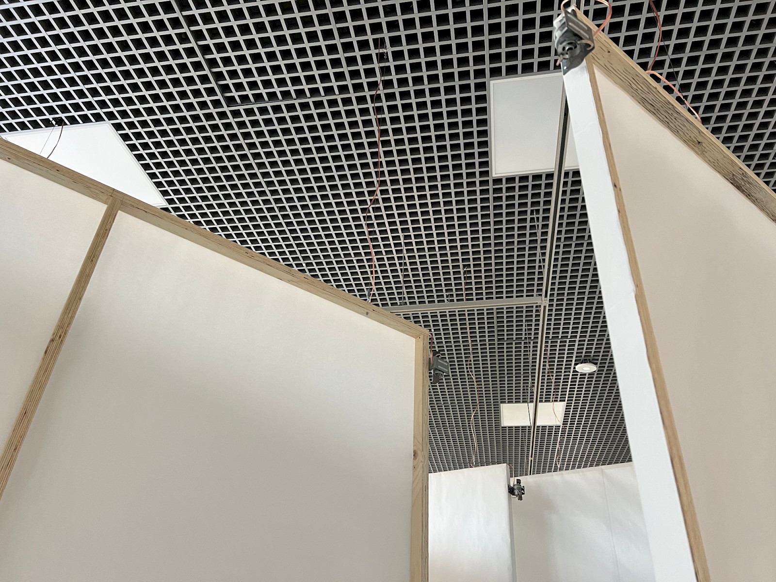 resonanzen I Geht man durch die offene Schiebetür, betritt man einen anderen Klangraum: Vom Metallgitterraster der Decke herab hängen sieben kleinere, ebenfalls quadratische Betonplatten wie ein Aggregat. Sieben Flächen, die einen offenen Würfel bilden, visuelle Korrespondenzen zu den Stufen der Treppe und der Grafik der Fenster im Hintergrund werden aufgenommen.