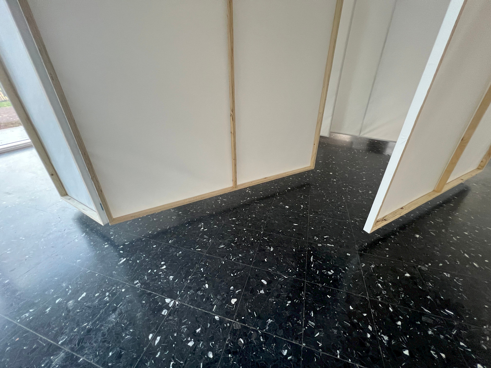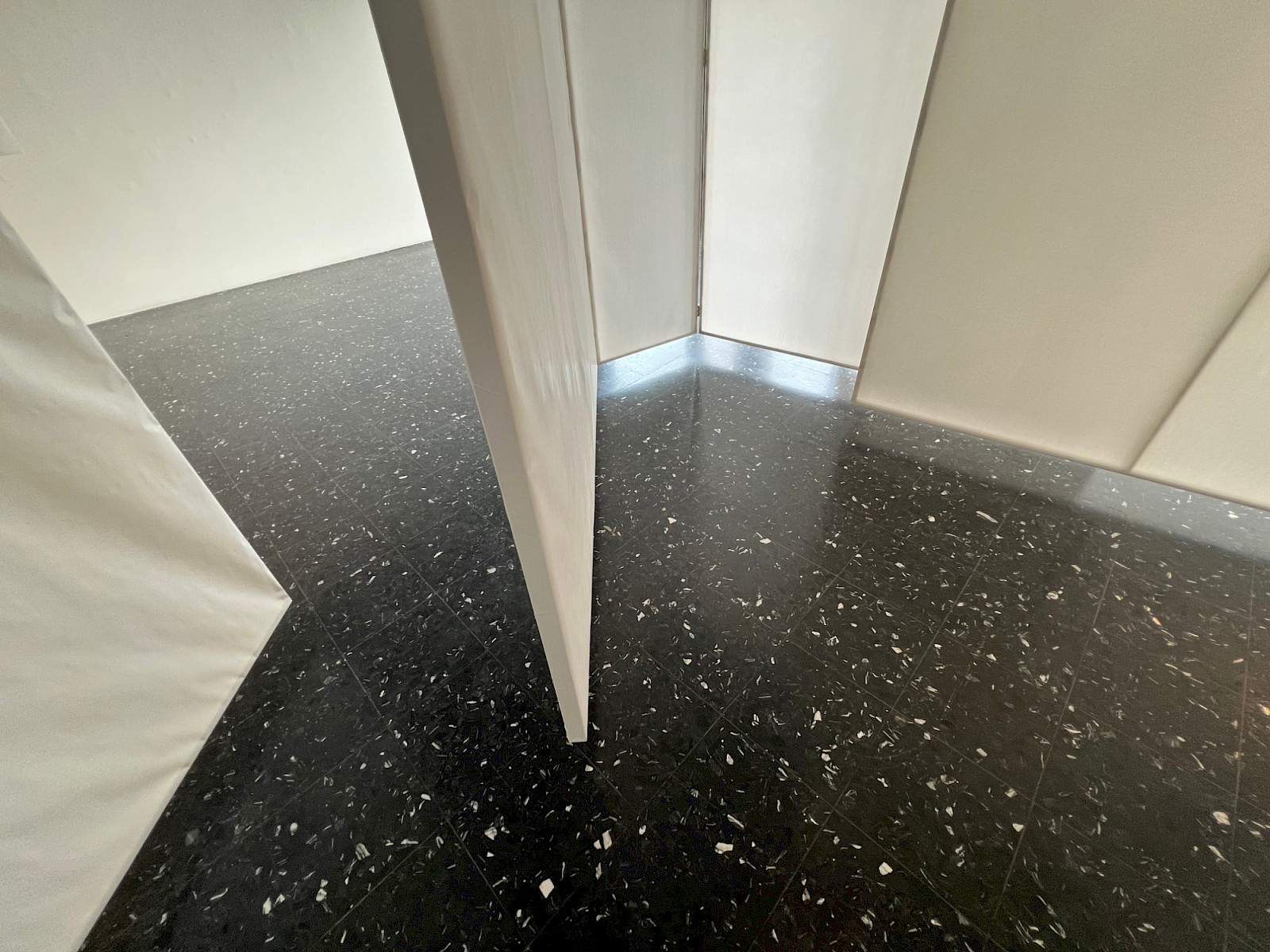 Die Galerieräume des Kunstvereins Trier Junge Kunst am Ende der Trierer Karl-Marx-Straße nahe der Römerbrücke befinden sich in einem alten Stadthaus und haben einen Grundriss, in dem es ursprünglich keine Symmetrie und Rechtwinkligkeit gibt.