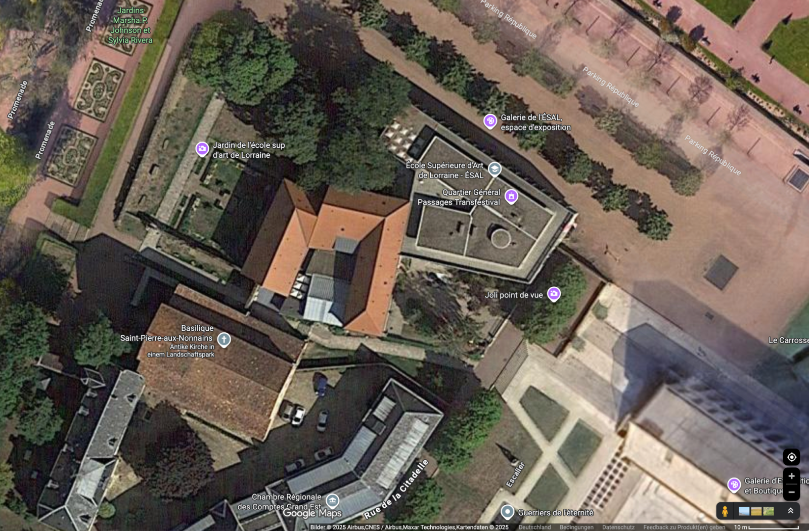 Die Galerie der ESAL liegt an der Rue de la Citadelle auf dem Gelände der ehemaligen Zitadelle von Metz, die im 16. Jahrhundert als Verstärkung der mittelalterlichen Stadtmauern errichtet, im 17. und 18. Jahrhundert weiter ausgebaut und Teil umfassender Befestigungsanlagen der Stadt Metz wurde, deren Ausformung ab dem 17. Jahrhundert auf die gestalterischen Prinzipien des Festungsbaumeisters Vauban zurückgeht. Anhand von historischen Karten und Stadtplänen lässt sich die Entwicklung der Zitadelle und der Festungsanlagen bis hin zum Festungsring um die Stadt nachvollziehen.
