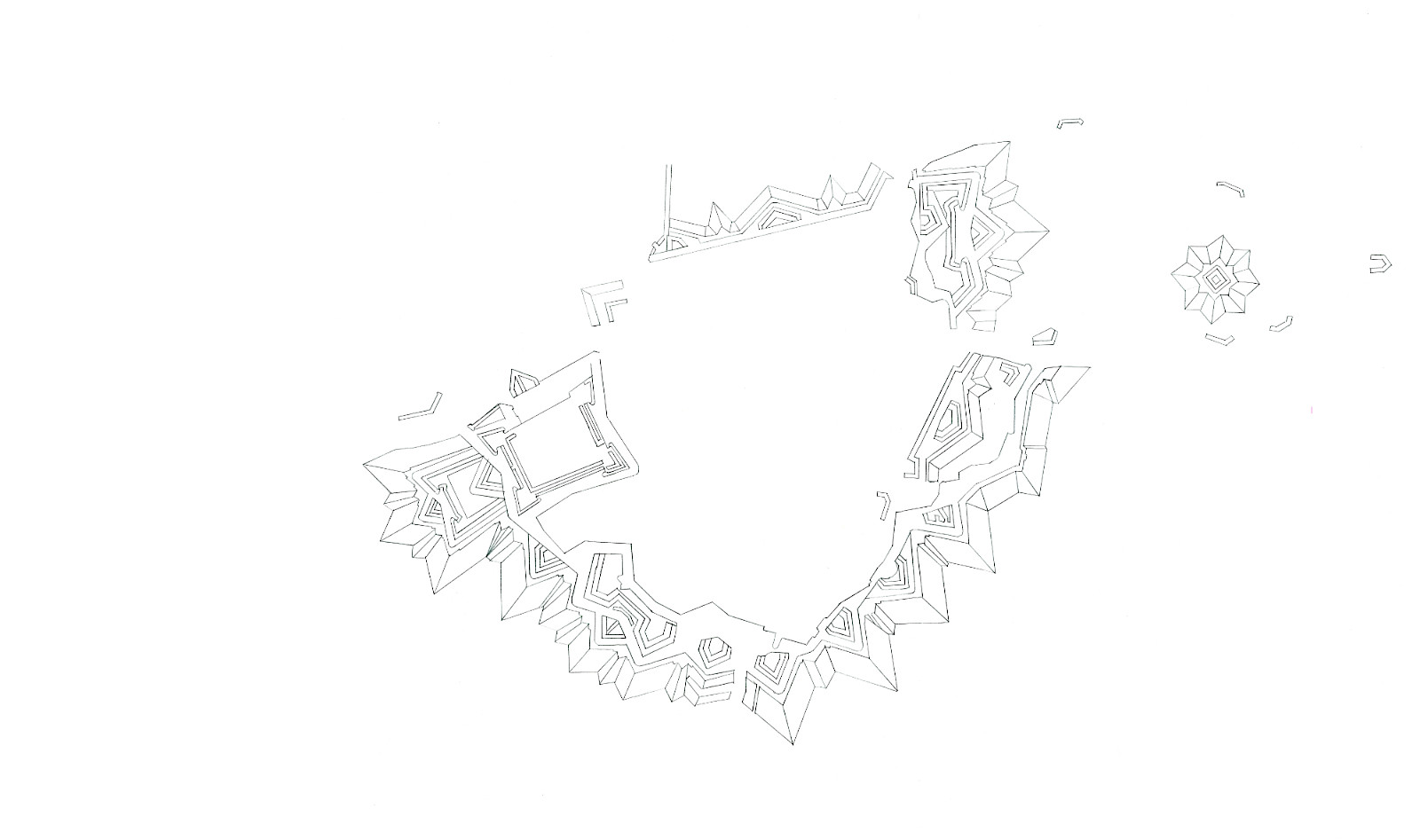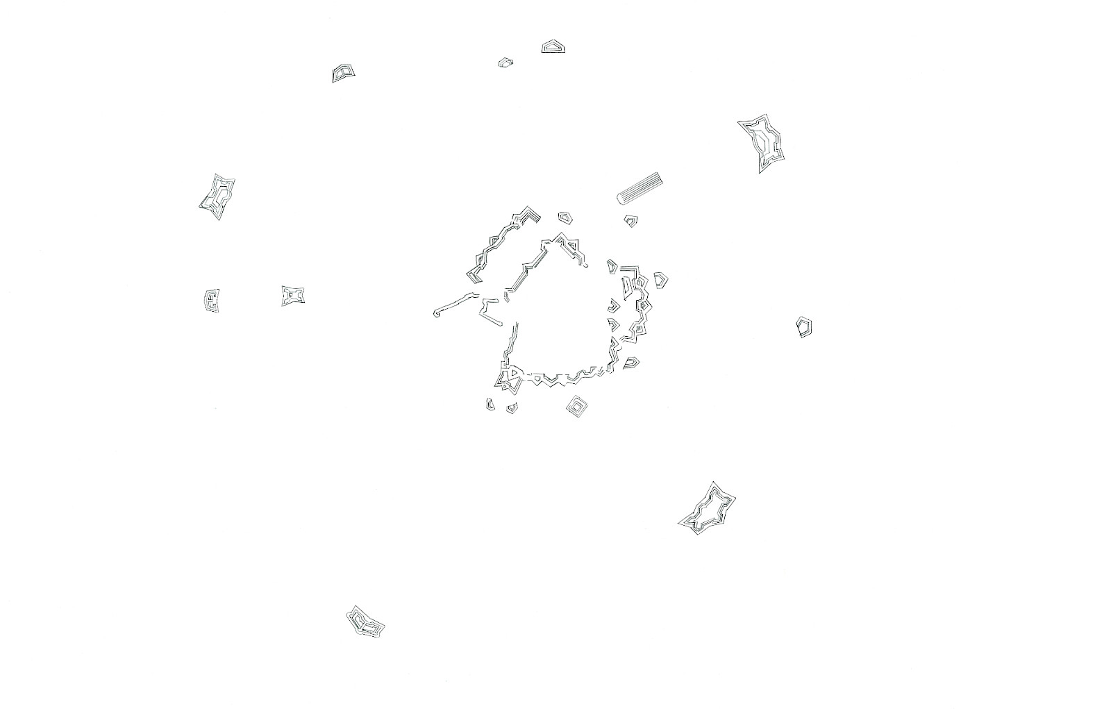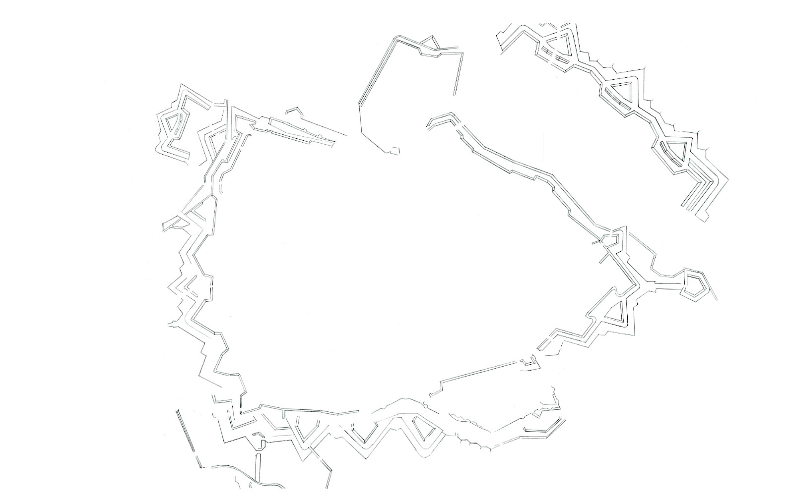 6-Kanal-Soundinstallation. Vierteiliges Raum-Objekt aus mit Papier (60 g Clairefontaine Kraftpapier weiß) bezogenen Holzrahmen (Höhe 2,45 m) mit Grundriss entwickelt aus Zeichnungen der Befestigungsanlagen der Stadt Metz und Formen des ESAL-Gebäudes, hängend (Drahtseile, Haken). 6 Unwuchtmotoren, 6 Lichtorgelplatinen zur Motorsteuerung via Sound, 6 Verstärkerplatinen, modulierte Sinustöne 1000 hz, Soundkarte, Rechner, Kabel. 8 Zeichnungen der Befestigungsanlagen der Stadt Metz und Umgebung aus historischen Stadtplänen (Transparentpapier, Bleistift).