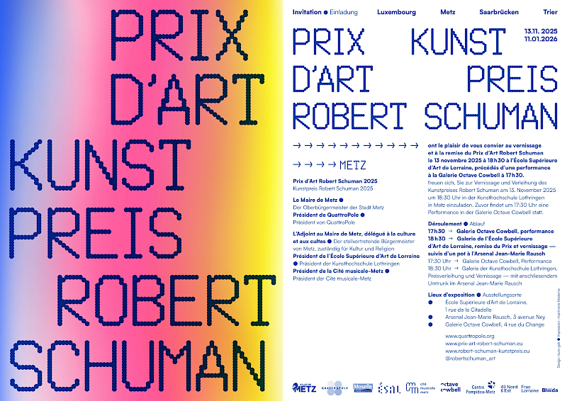 Arnold, Kerstin (D) Baur, Julia (D) Becheanu, Stefania (F) Becker, Tobias (D) Belet, Lorraine (F) Brieske, Claudia (D) Crisan, Stefania (F) Debert, Arthur (F) Dessecker, Christiane (D) Dul, Krystyna (L) Ecker, Serge (L) Eckhardt, Frauke (D) Folmer, Wolfgang (D) Fort, Hippolyte (F) Freitas, João (L) Fritz, Karen (D) Golczewski, Andreas (D) Grethen, Elodie (F) Haaren, Bettina van (D) Haaser, Kathrin B. (D) Hafez, Nazanin (D) Hahn, Daniel (D) Hannicq, Claire (F) Haring, Anne (D) Herold, Barbara (D) Hildebrandt, Gregor (D) Himmel, O.W. (D) Huppert, Leslie (D) Ickrath, Sebastian, Joachim u. Lilith (D) Kaminski, Lydia (D) Kammerloch, Ida (D) Kocks, Susanne (D) Krenkel, Katharina (D) Lanotte, Elodie (F) Linder, Darja (D) Loos, Vera (D) Magar, Karin (D) Martig, François (F) Moritz, Margaux (F) Noesen, Suzan (L) Ólafsdóttir, Sigrún (D) Paqué, Shakti (D) Penje, Paulette (D) Rabusai, Julia (D) Riethmüller, Gertrud (D) Schlegel, Johanna (D) Schmidt, Jutta (D) Schmitt, Lisa-Marie (D) Schwamborn, François (D) Smorodinova, Marina (F) Stöhr, Anne-Marie (D) Stoll, Klaudia (D) Strickmann, Peter (D) Sumalvico, Cordula (D) Sztremer, Małgorzata (D) Thalau, Birgit (L) Vadala, Romain (F) Wien, Christiane (D) Zimmermann, Gisela (D) Zöllner, Stefan (D) und KOLLEKTIV BREMM (Jannik Aulenbacher, Marc Backes, Ulrich Behr, Florian Budke, Fabienne Grund, Mane Hellenthal, Stefan Ochs, Lukas Ratius, Alexandra Schartner, Véronique Verdet)